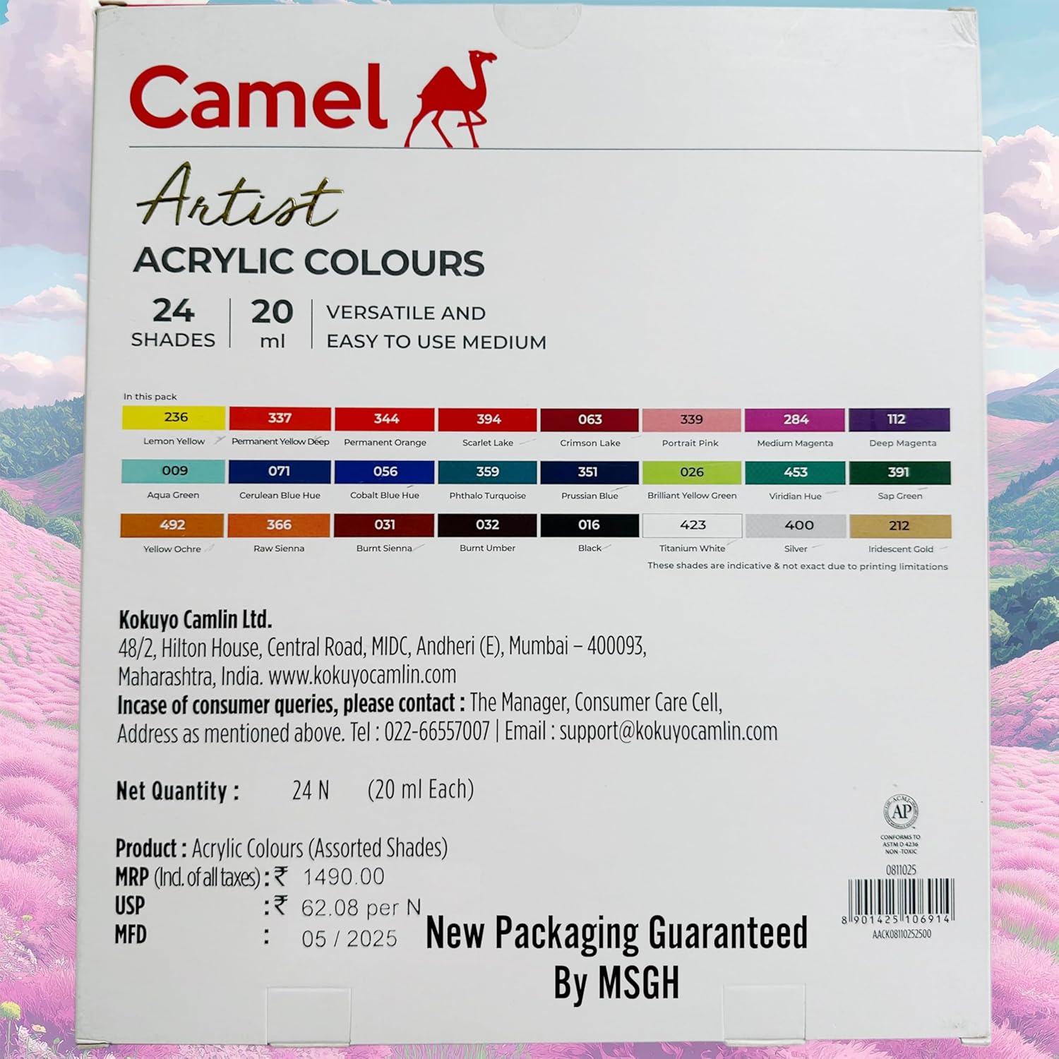 Camel Artist Acrylic Colours ??? 24 Shades ?? 20ml is a premium acrylic paint set ideal for artists, students, and hobby painters. These high-quality acrylic colours offer rich pigmentation, smooth consistency, quick drying, and excellent colour blending. Suitable for use on canvas, paper, wood, fabric, and more. Perfect for fine art, craft work, and professional painting projects by Camel.
